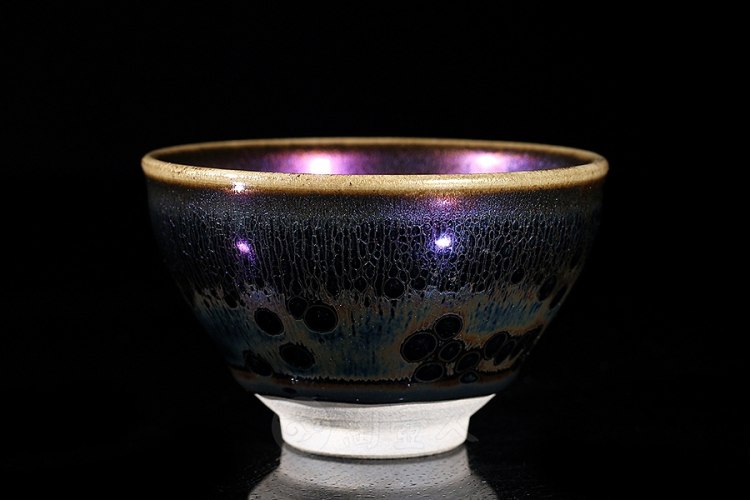 建盏施半釉会露出胎底的部分,可以很直接的看到建盏底部的颜色。而铁胎的颜色是铁灰色,新盏由于窑内氧化,也会呈红褐色;老盏还会因为长期埋在泥土中,造成表面颜色发生变化。不过,表面铁灰色不一定就必然是铁胎,因为从宋代就有很多窑工为了模仿铁胎,把建盏露出来的胎涂成铁灰色。而现代技术发达,仿制更容易,所以铁灰色只能作为参考。