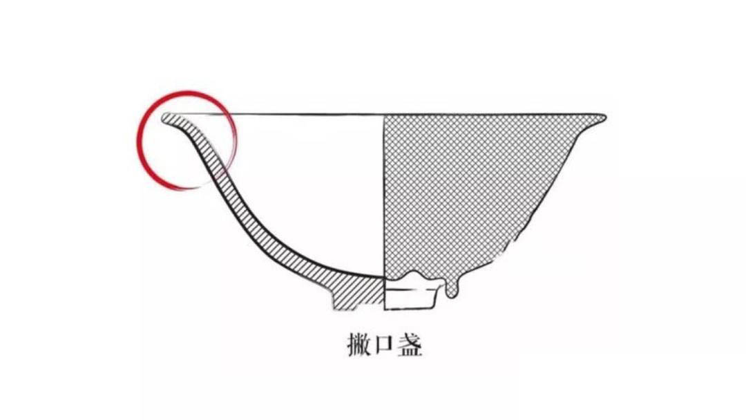 撇口盏盏口向外撇,唇沿稍有曲折,腹部较长,且带有弧度,浅圈足。宋时,主要用于分茶。有深腹、浅腹两种形式。