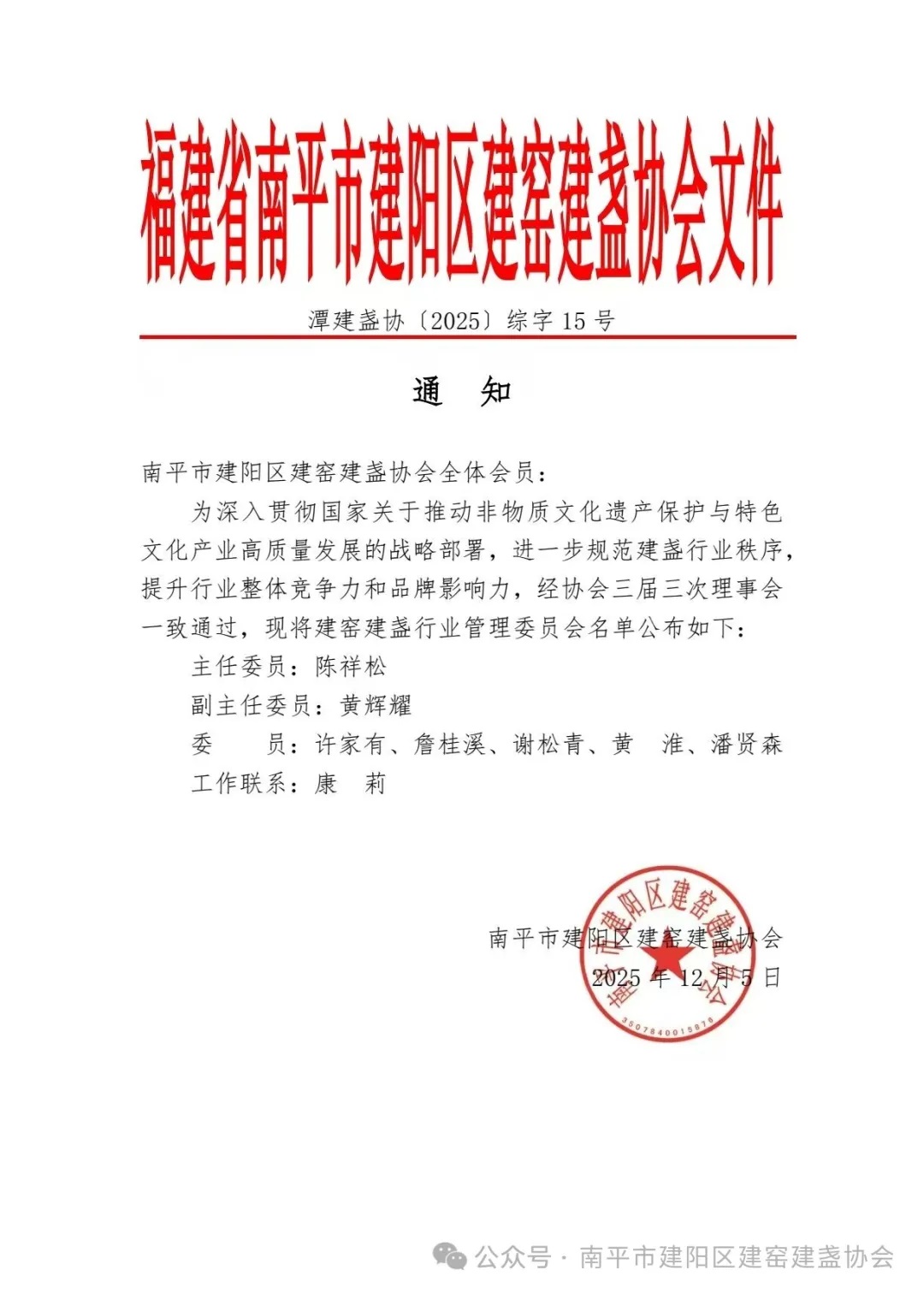 南平市建阳区建窑建盏协会建窑建盏行业管理委员会名单