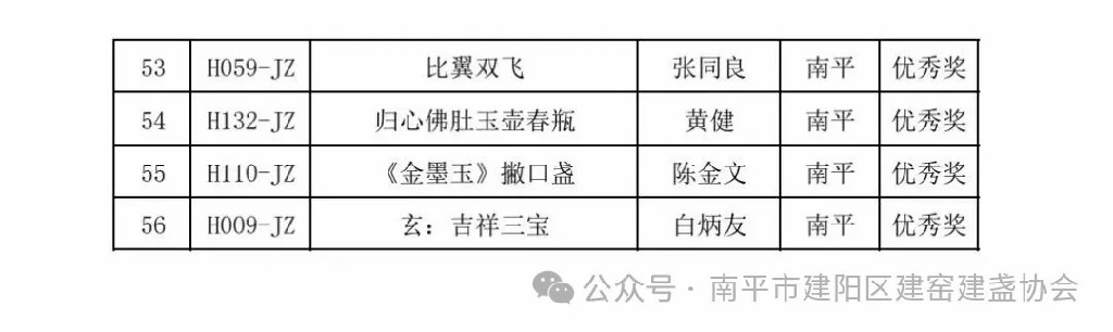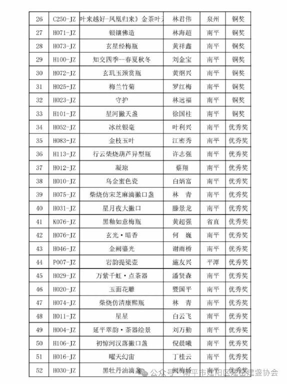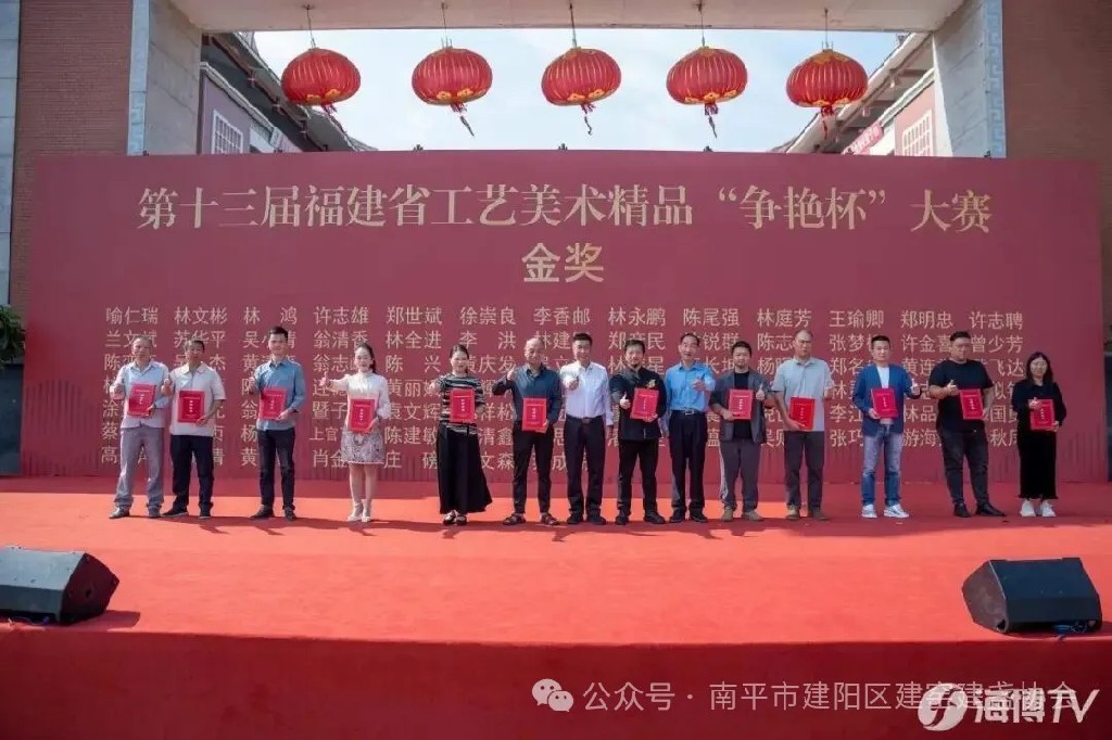 经严格评审,最终评选出金奖85件、银奖137件、铜奖189件及优秀奖260件,其中建盏56人获奖,莆田市工信局、莆田市二轻联社等6家单位获优秀组织奖。11月2日,本届大赛颁奖仪式在莆田工艺美术城盛大举行。省人大常委会委员、莆田市工艺美术产业发展领导小组组长阮军,省工信厅副厅长陈传芳出席颁奖仪式,并为获奖代表颁发证书。