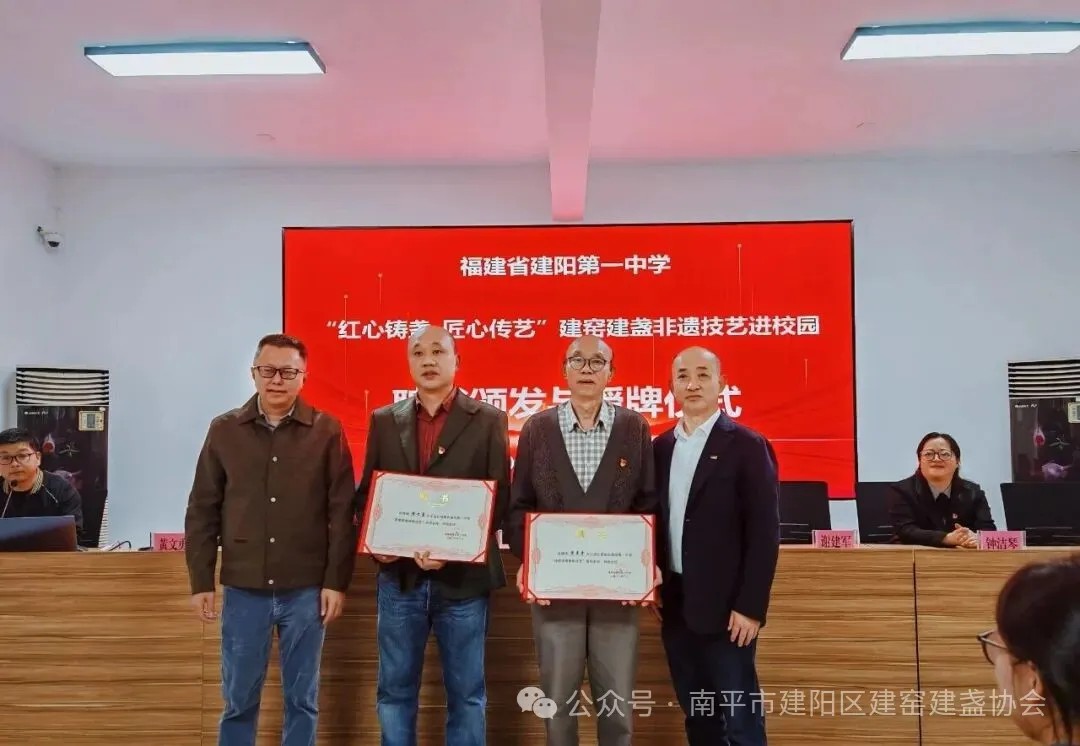 活动伊始,建阳一中党总支书记虞朝军、校长谢建军为黄美金、黄文勇两位非遗传承人颁发“建窑建盏烧制技艺”指导老师聘书;建阳区文体旅局副局长陈莉丹为建盏大师弟子授予非遗辅导员证书;学校还与建阳建盏协会党支部、黄美金艺术馆分别签订党建共建、社会实践基地协议并授牌,为非遗传承注入长效动能。