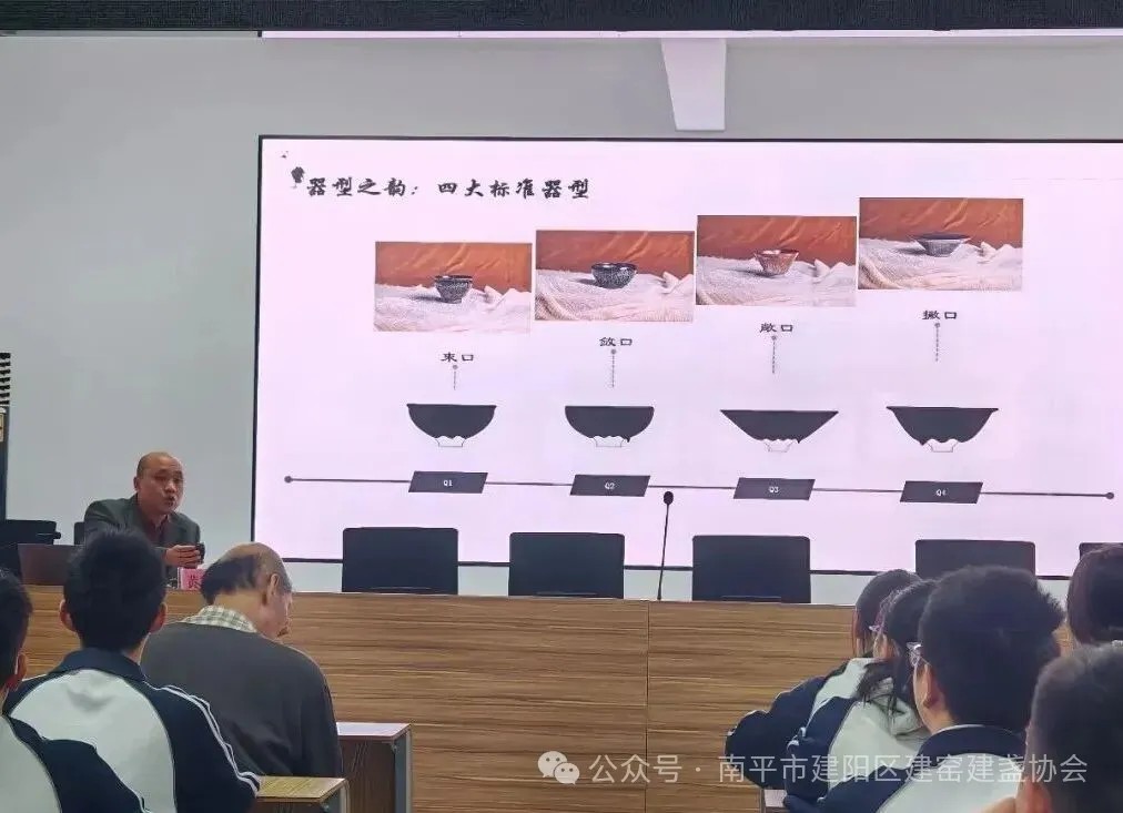 理论课堂上,黄美金、黄文勇大师以《宋代茶器的秘密》为题,深入浅出讲解建盏历史、釉色特点与工艺精髓,从金油滴、七彩曜变的艺术创新,到水吉后井村的发源地故事,让同学们沉浸式感受宋瓷魅力。互动问答环节气氛热烈,6道非遗知识抢答点燃全场,答对同学收获建盏礼品,在趣味中巩固文化知识。