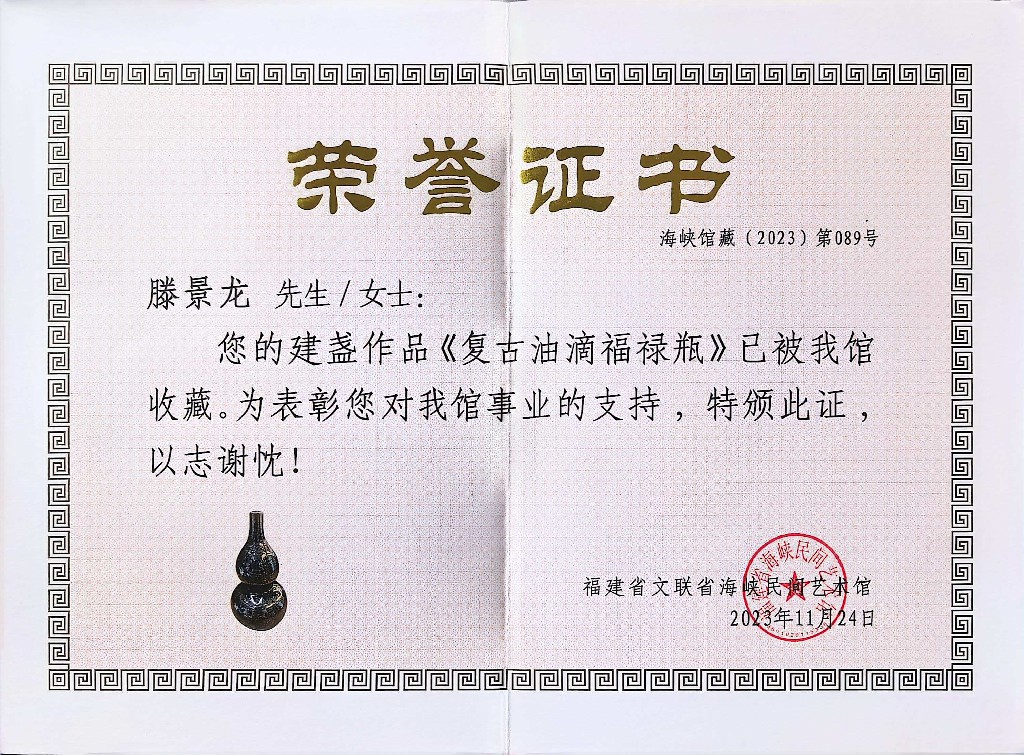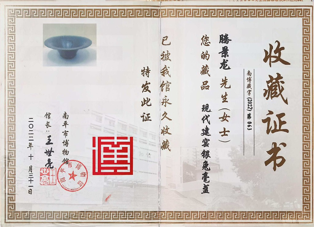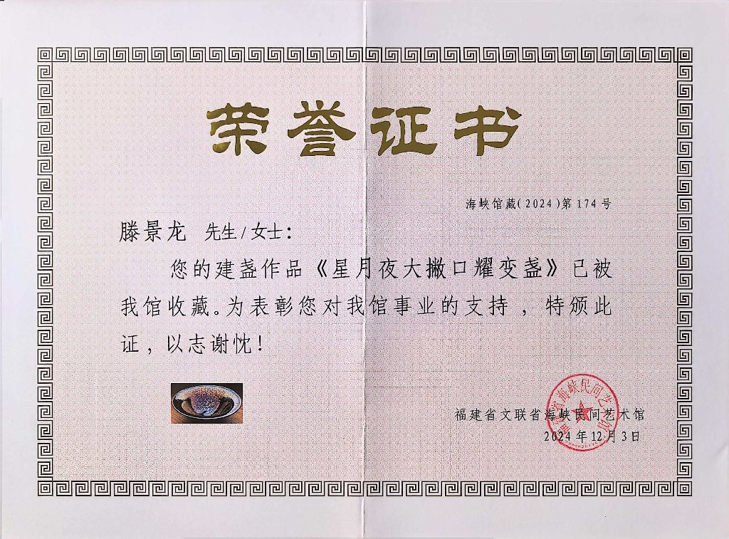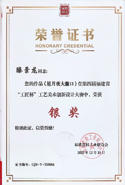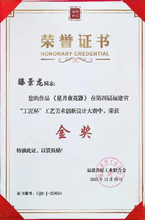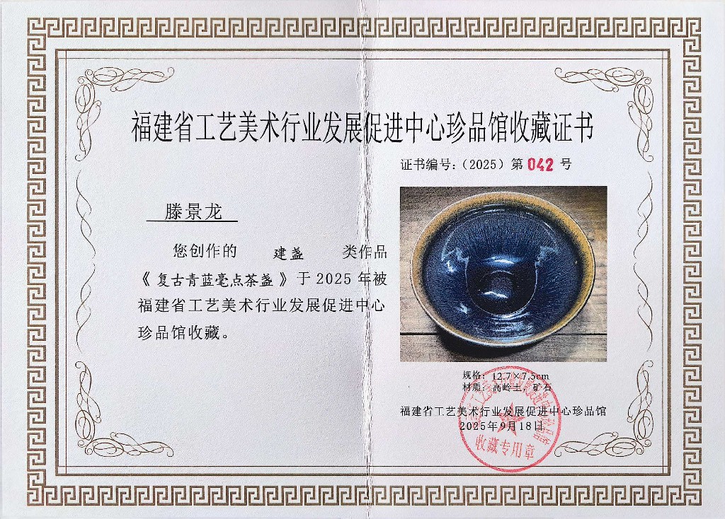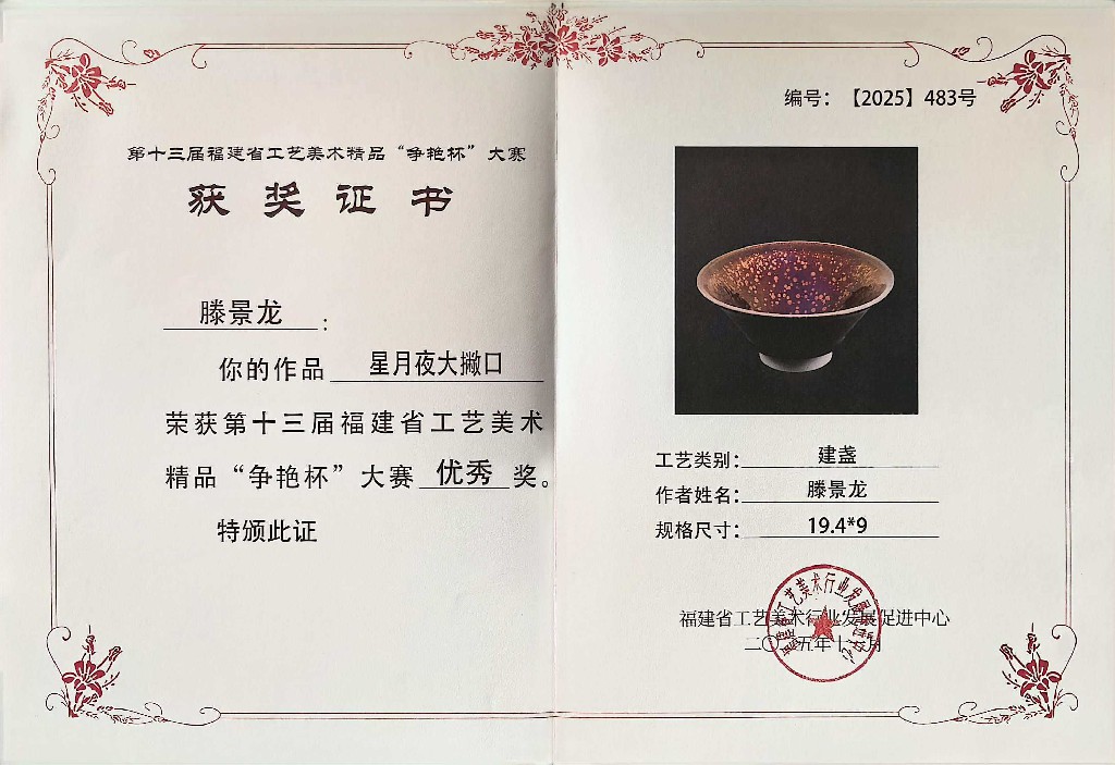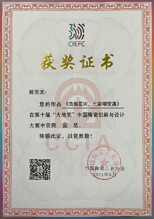 滕景龙 南平市建阳新宸贸易有限公司/技术总监 中级工艺美术师、福建省陶瓷协会会员、南平市建阳区建盏协会会员、福建省工艺美术协会会员、南平市民间文艺家协会会员、南平市企业促进会会员、福建省手工艺协会理事、南平市建阳区新的社会阶层人士联谊会副会长。2021 年 8 月作品(浩瀚星河七彩曜变盏)荣获中国陶瓷工业协会“大地奖”金奖
