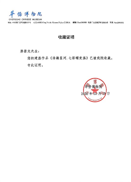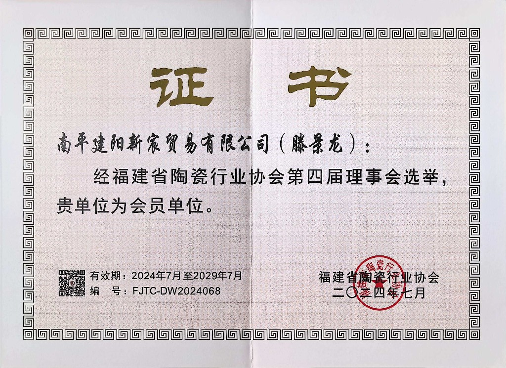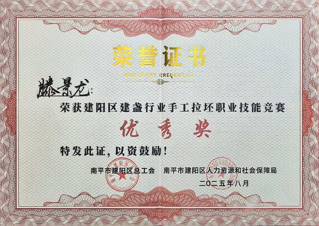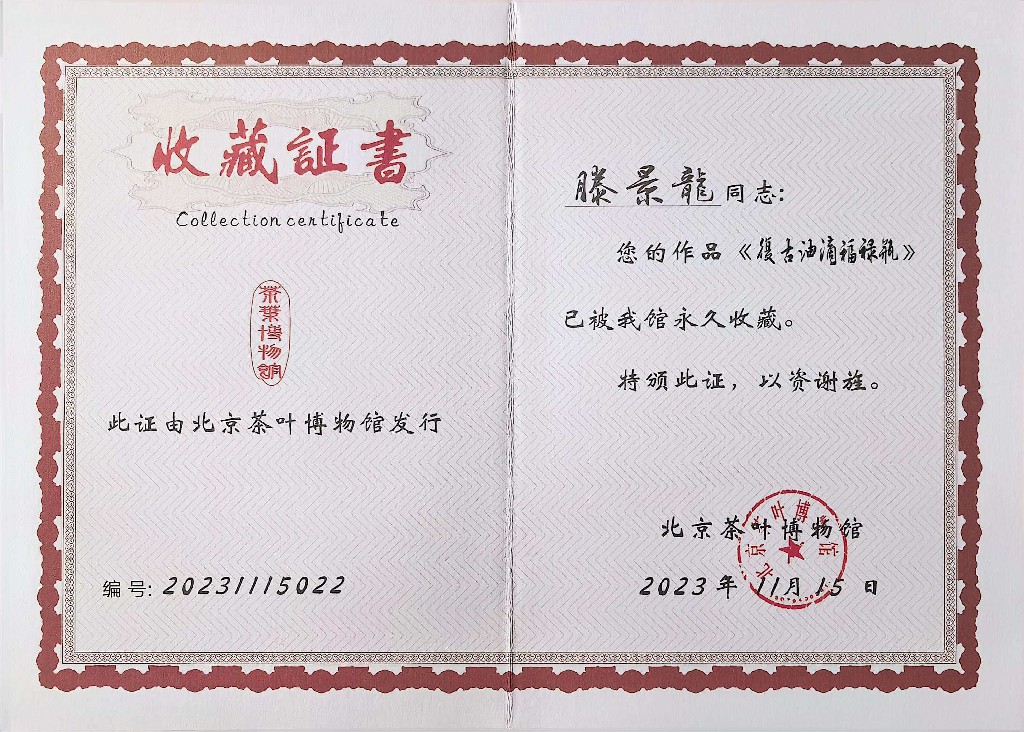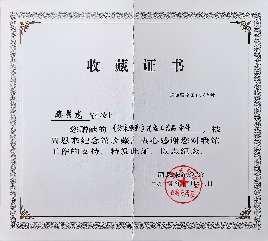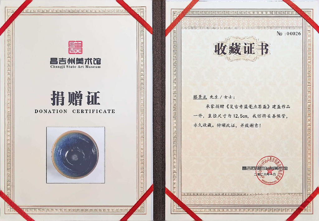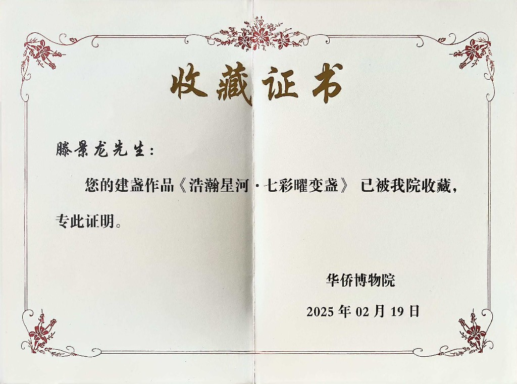 滕景龙 南平市建阳新宸贸易有限公司/技术总监 中级工艺美术师、福建省陶瓷协会会员、南平市建阳区建盏协会会员、福建省工艺美术协会会员、南平市民间文艺家协会会员、南平市企业促进会会员、福建省手工艺协会理事、南平市建阳区新的社会阶层人士联谊会副会长。2021 年 8 月作品(浩瀚星河七彩曜变盏)荣获中国陶瓷工业协会“大地奖”金奖