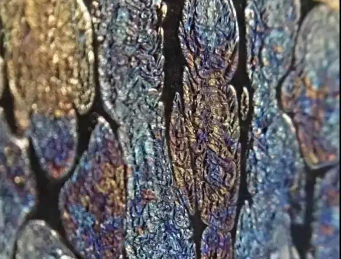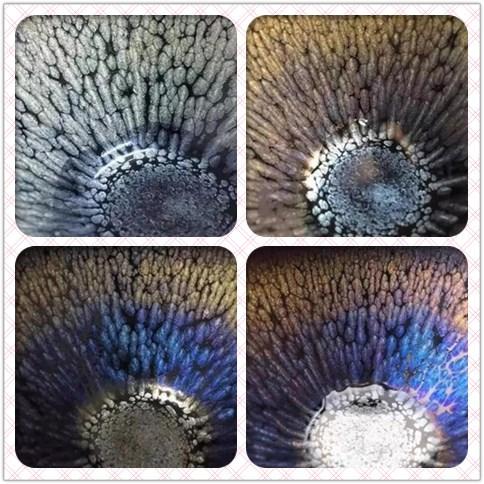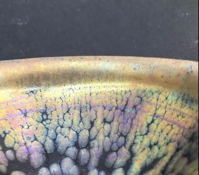 观之已养成七彩的建盏,放大细看,七彩色皆在结晶体中,如下图