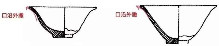 首先看口沿:撇口盏口沿明显外撇,而敞口盏口沿没有外撇,比较利落;其次看盏腹:撇口盏盏腹有明显弧度,而敞口盏盏腹外壁斜直。