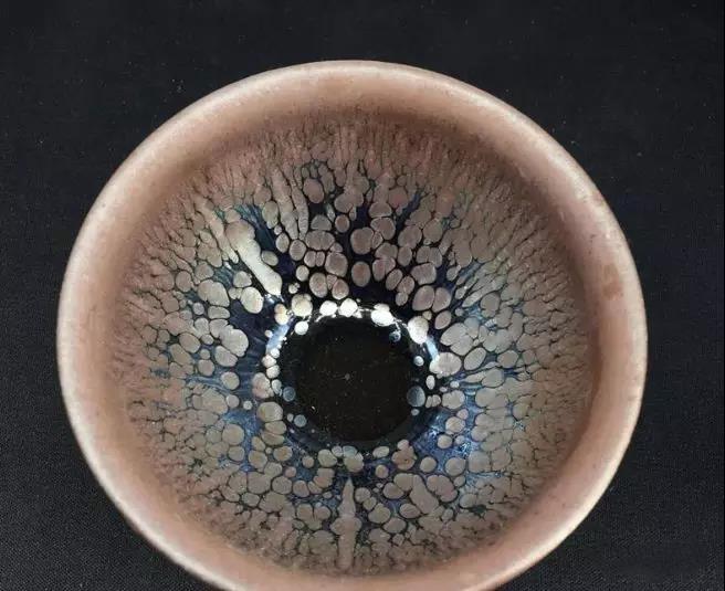曜变是建盏中可遇不可求的宝物,说是“千年难求,万量无一”,是烧盏人梦中而又为之奋斗期待的东西。其实,“曜变”就是在黑色的底釉上聚集着许多不规则的圆点 ,圆点呈黄色,其周围焕发出以蓝色为主的曜眼的彩虹般的光芒,故而得名。