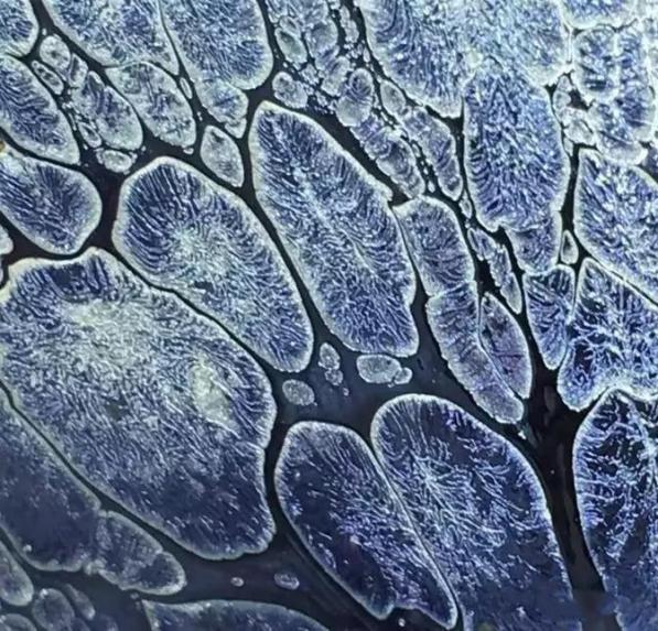 而上图这种玻化的兔毫盏则是比较难养的,没有个一年半载是很难有变化的。因此,挑选建盏第一要诀,应该是看釉面。一枚适合养的盏,最好是玻化恰到好处,有明显结晶,手感能感受到釉面的不平整,手机放大看能够有结晶体,非光滑的。(什么是结晶?类似下图)