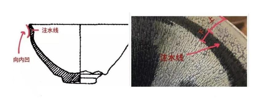 束口的特征:口沿曲折,外缘向内凹,内壁这相应形成一周凸圈(注水线)。